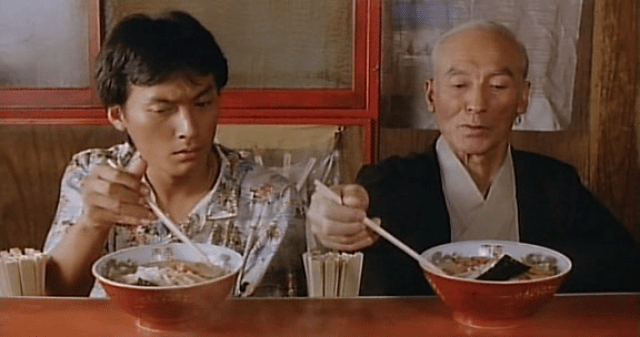 Tampopo balances social satire and humour with ease. One example is a woman who momentarily returns from the dead to cook a meal for her family, then dies – the father insists the children should stop mourning and instead eat the food while it’s still warm. Elsewhere, a group of young Japanese women are given an etiquette class in how to eat spaghetti without slurping, so as not to offend any Western men they are trying to court; on a neighbouring table, a Western man slurps his meal like a noisy hoover on a dusty carpet.