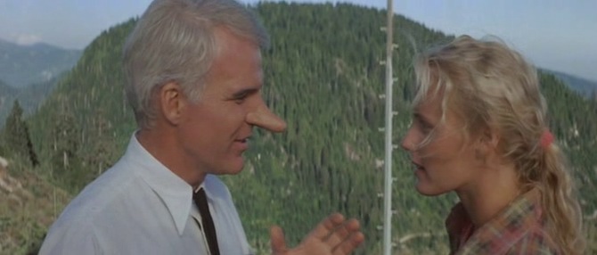 The secret to Steve Martin’s goofy film persona has always been how quickly he can sink into sincere romanticism. There’s the unexpected serenade in The Jerk, and the canal trip in The Man with Two Brains. So the story of Cyrano de Bergerac is ideal source material for Martin, wearing an oversized prosthetic nose, as a fireman in love with Daryl Hannah – but presumes early on she’ll never see past his Pinocchio facial feature.